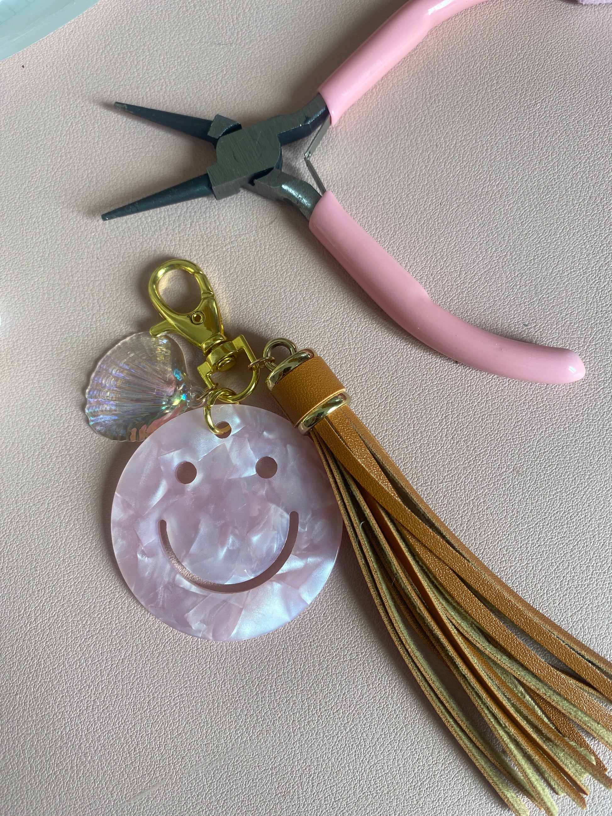 > breloques: pompon en cuir marron || pendentif smiley en acétate de résine || coquillage en acrylique