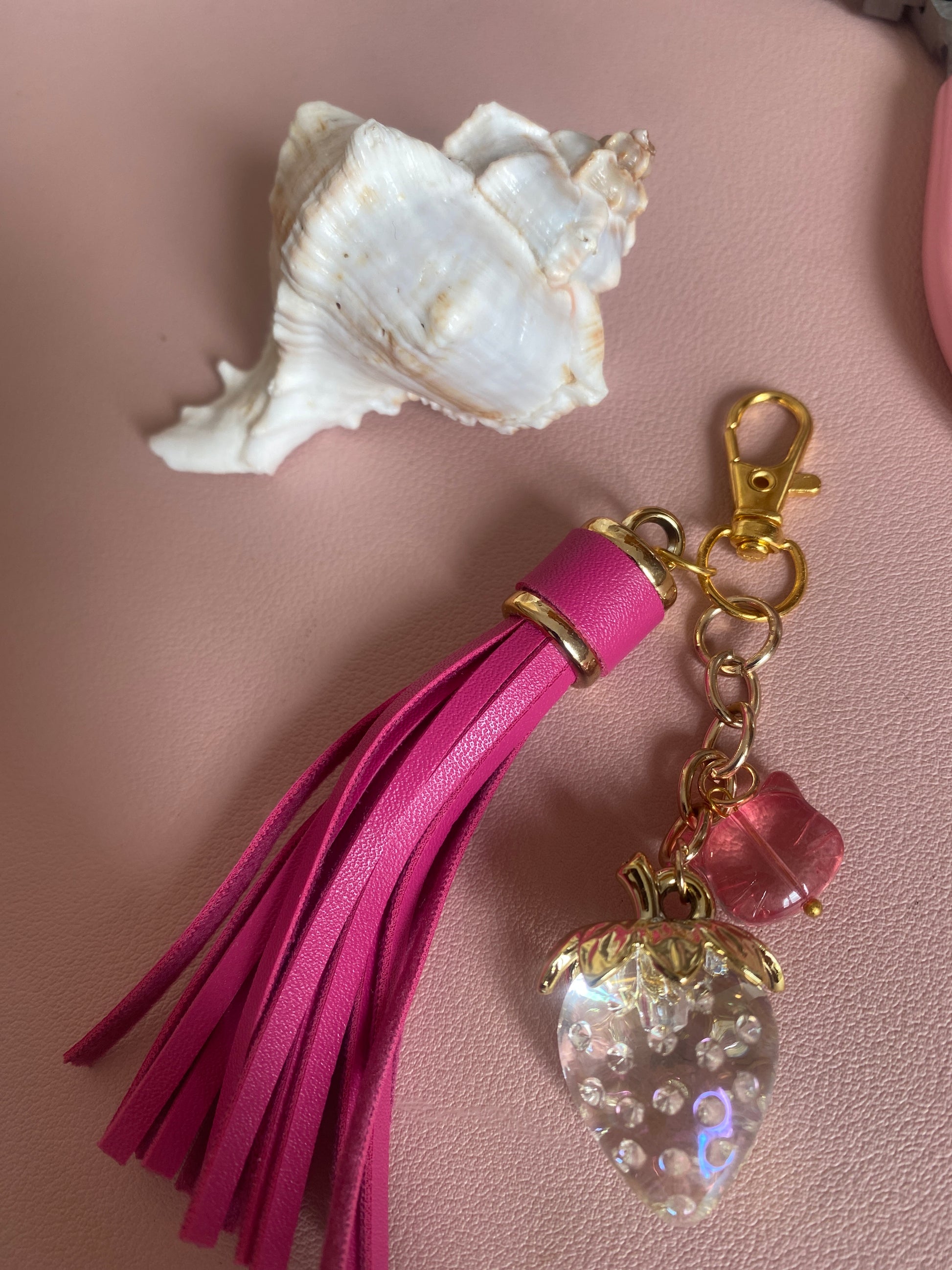 > breloques: pompon en cuir fuchsia || pendentif fraise & petite tête de chat en acrylique