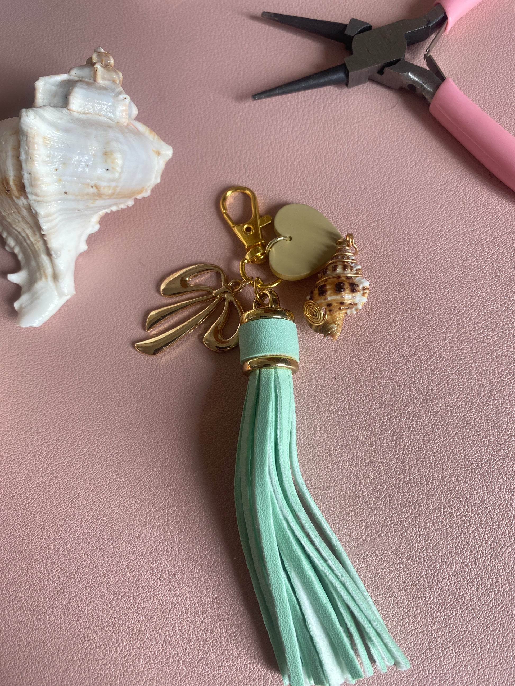 > breloques: pompon en cuir turquoise || breloques coquillage || cœur en acrylique || petit noeud en laiton