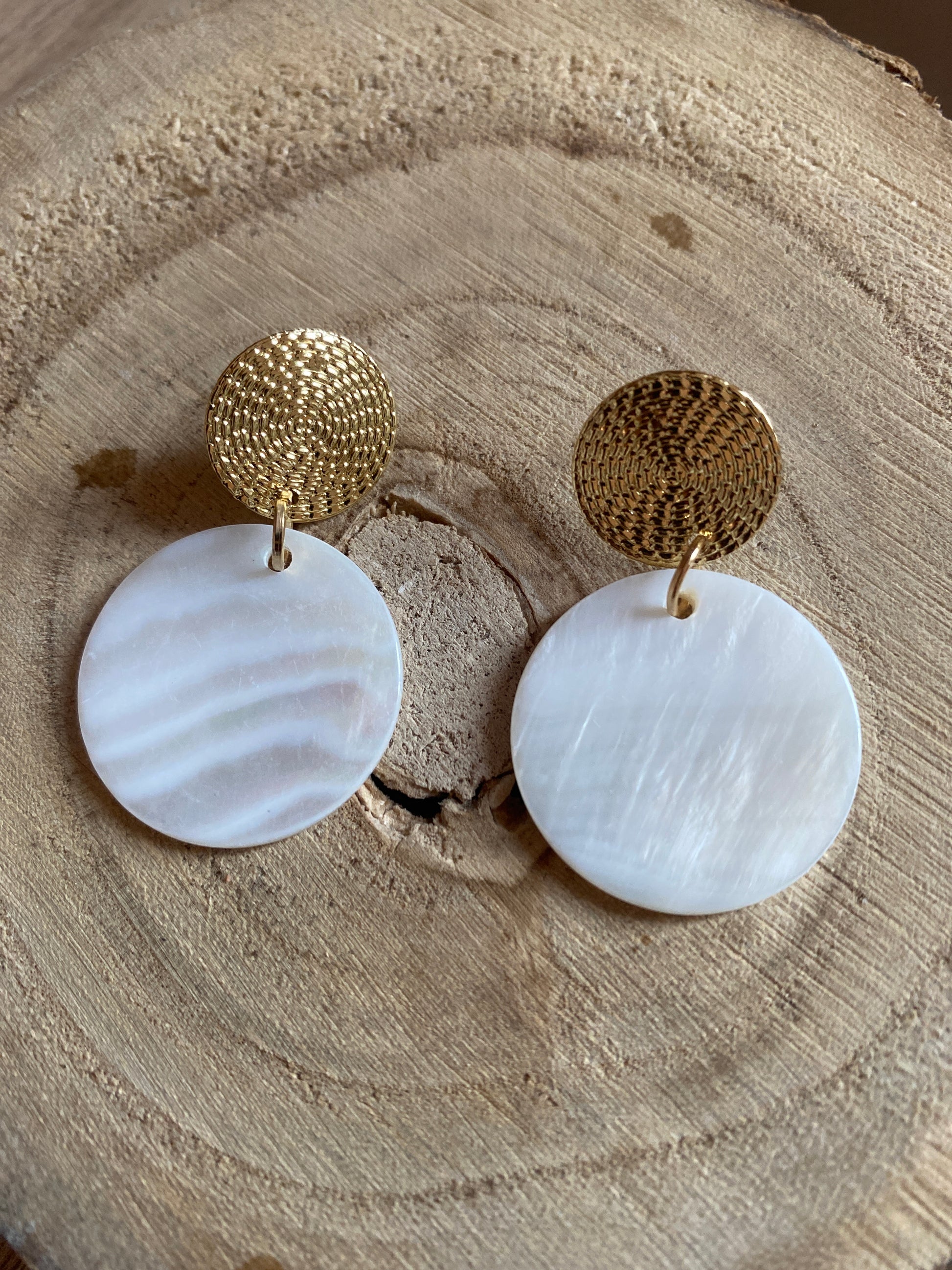 🧿 Matériaux : Puces rondes martelées dorées en acier inoxydable || pendentif cercle en nacre véritable.