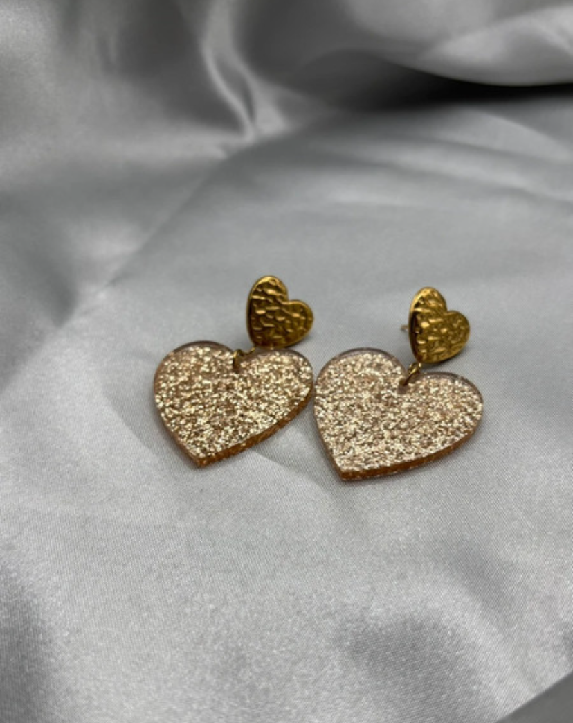 🧿 Matériaux : Puce en forme de cœur doré en acier inoxydable || Pendentif cœur doré à paillettes en acétate de résine.