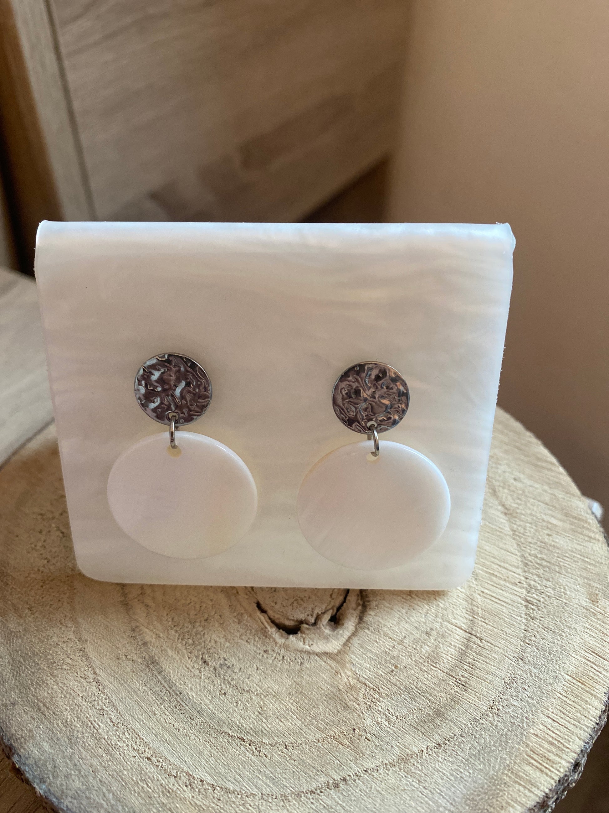 🧿 Matériaux : Puces rondes martelées argentées en acier inoxydable || pendentif rond en nacre véritable.