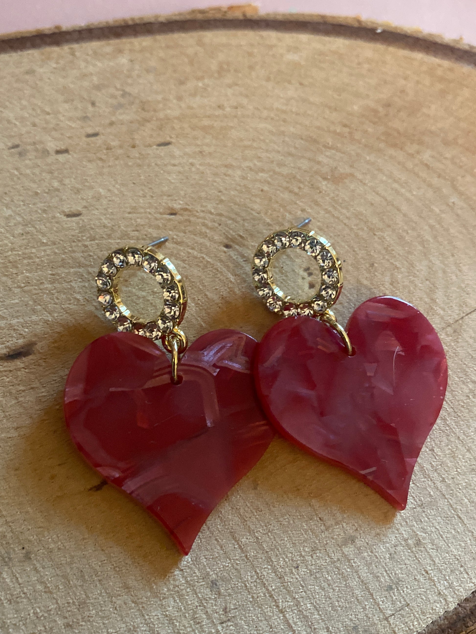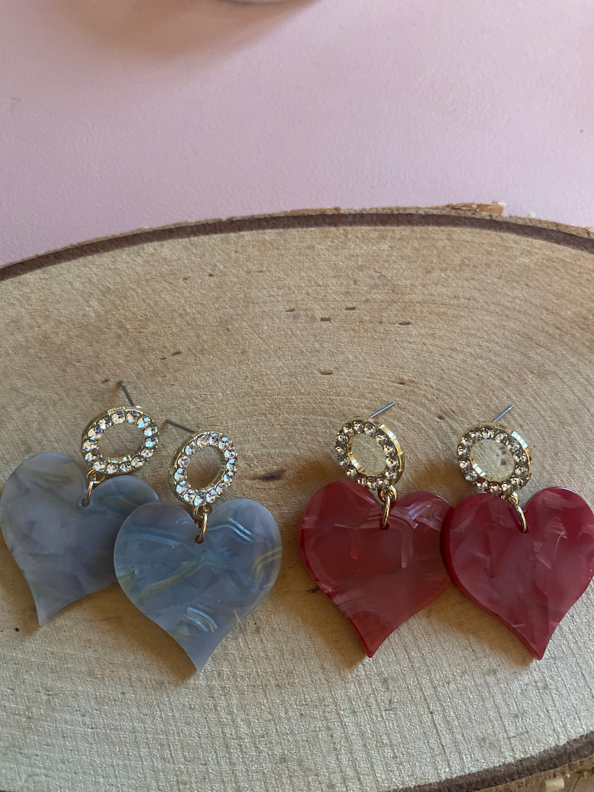 🧿 Matériaux : Puces rondes dorées à strass en acier inoxydable || pendentif coeur en acétate de résine. Couleur au choix.