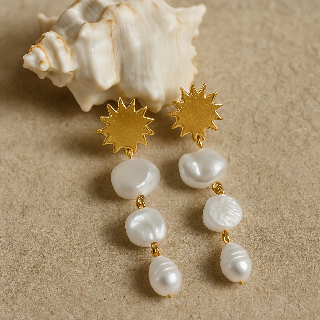 🧿 Matériaux : Puces dorées en forme de soleil en acier inoxydable || Assemblage de perles blanches.